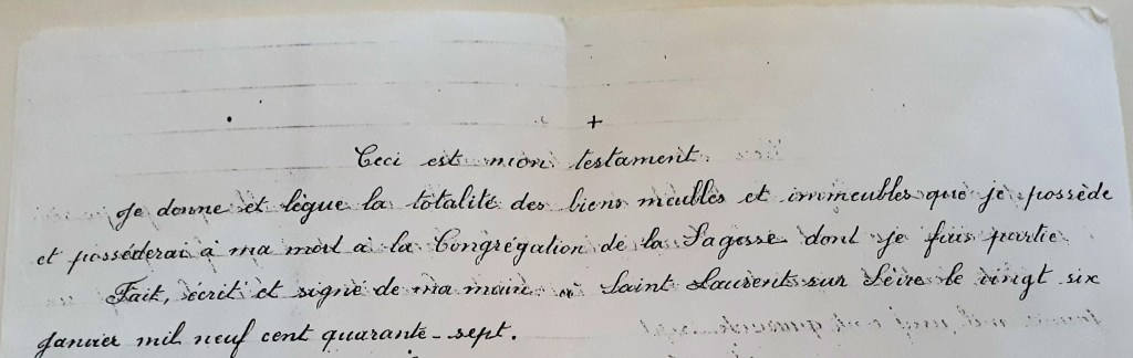 …Ma tante avait suivi l’exemple d’un autre membre de la famille, certainement élargie, qui elle-même était devenue religieuse dans cette congrégation. Ma tante, dans les derniers temps, m’avait montré le cimetière à Saint-Laurent-sur-Sèvres où joyeuse elle savait qu’elle y serait enterrée. Elle était satisfaite aussi d’y rejoindre cette aïeule qu’elle n’avait pas vraiment connue mais qui l’avait si profondément influencée.