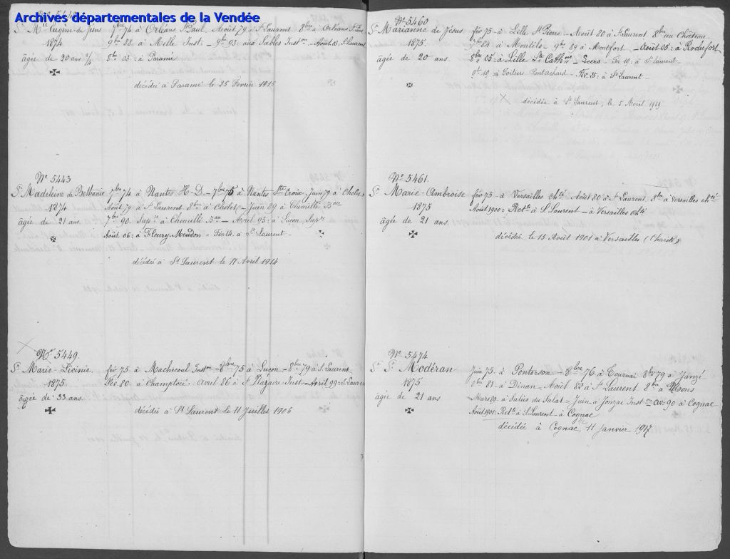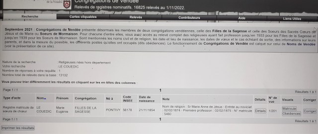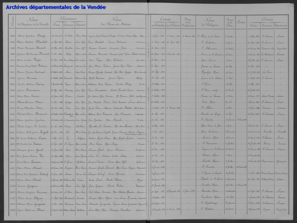 En 2021, la congrégation des Filles de la Sagesse a accepté de mettre en ligne ses archives ici accessibles sur le site des archives départementales de la Vendée. Je n’y trouve pas ma tante puisque la mise en ligne s’arrête avant son noviciat. Seulement, je n’ai ni son nom de religieuse, ni son nom réel.