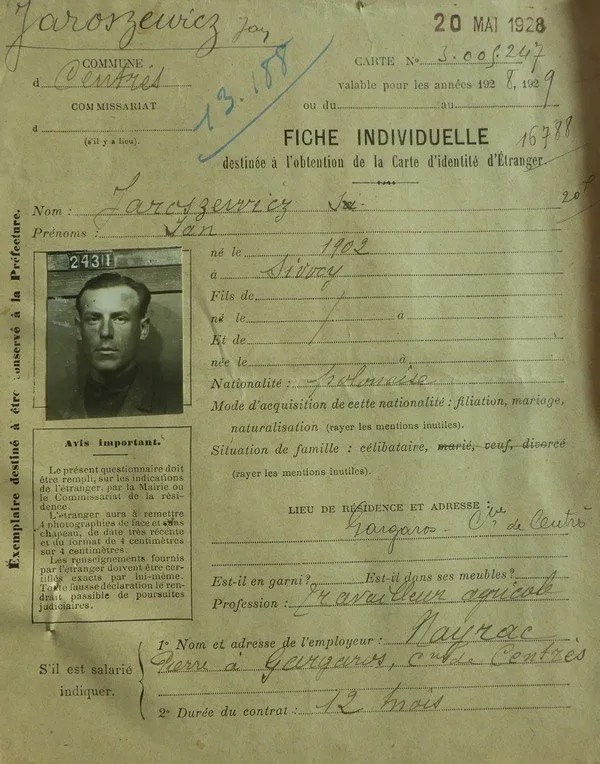 Tout étranger de plus de quinze ans et séjournant plus de quinze jours en France, a l’obligation de posséder cette carte, délivrée par les préfets, et de la faire viser à chaque changement de résidence. Archives départementales du Pas-de-Calais