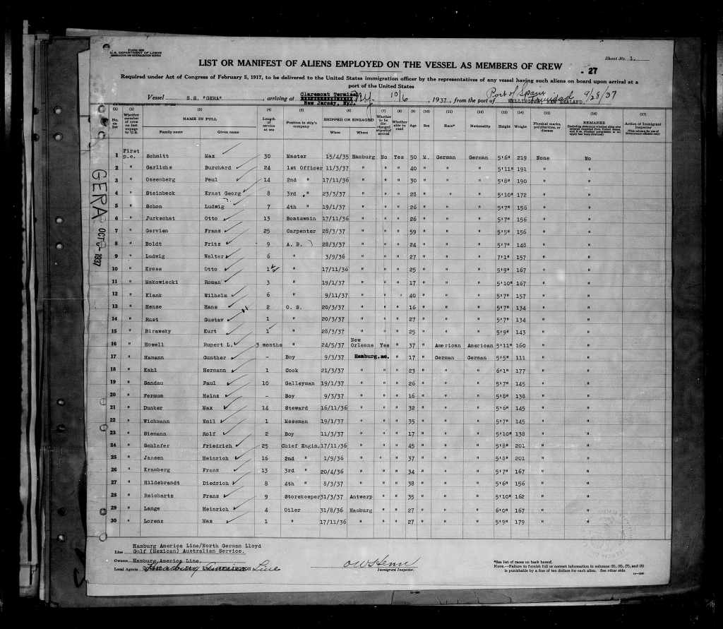 Arrivée de Wilhem Klank, allemand, à NY 1937.