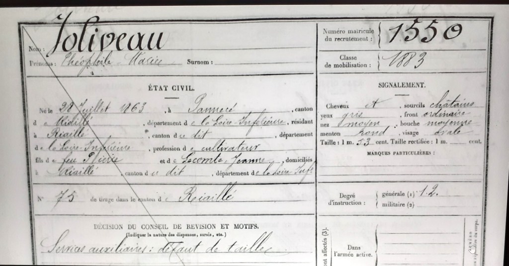 Son second frère Théophile Marie est né le 28 juillet 1863* toujours dans le même hameau. Sa fiche de conscrit nous renseigne sur sa petite taille (objet de l’éviction de son service militaire) et sur son niveau d’étude. Il sait lire et écrire, mais n’a pas un niveau primaire. On apprend aussi qu’il a habité Cholet. Son décès est aussi mentionné à 37 ans.