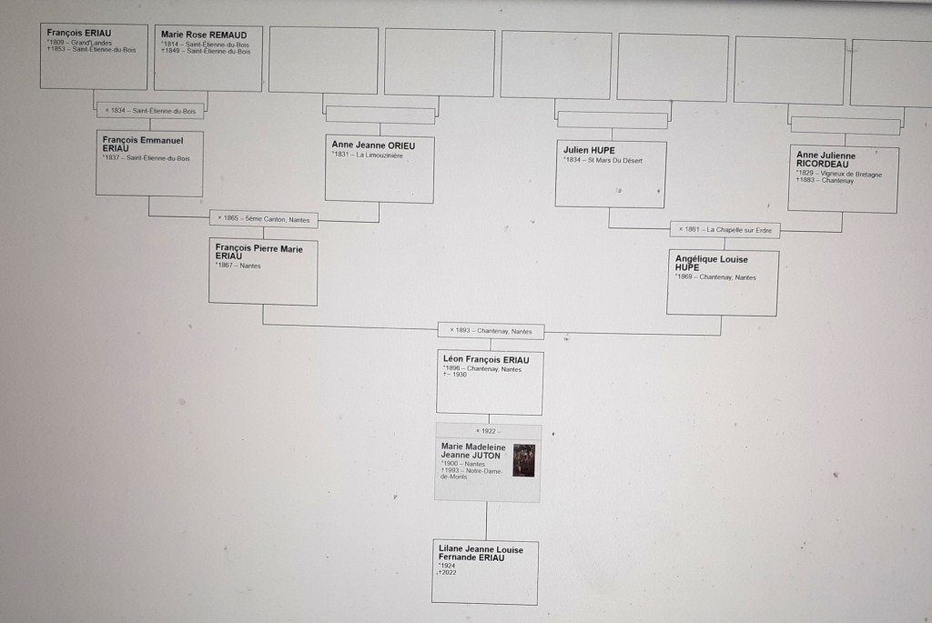 Marie s’est mariée le 12 mai 1922* à Chantonay sur Loire. Elle est majeure et habite certainement encore chez ses parents au 22 rue Amiral du Chauffault. Son mari Léon Ferdinand Eriau est quatre ans plus âgé qu’elle. Lui aussi vit dans la même commune. Leur fille Liliane Jeanne Louise Fernande naît six mois plus tôt, le 4 juillet 1924. Sûr que les deux sœurs ont dû se sentir proches de partager cette aventure !